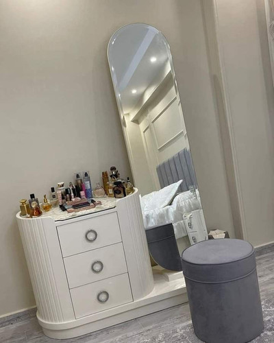 ۲. میز آرایش آینهقدی و ست کامل برای اتاقهایی با فضای بیشتر، میزهای آرایشی که به صورت یک ست کامل با آینه قدی مجزا یا متصل طراحی شدهاند، ظاهری یکپارچه و مجلل ایجاد میکنند. این ستها معمولاً فضای ذخیرهسازی بسیار بیشتری نسبت به میزهای رومیزی دارند.
